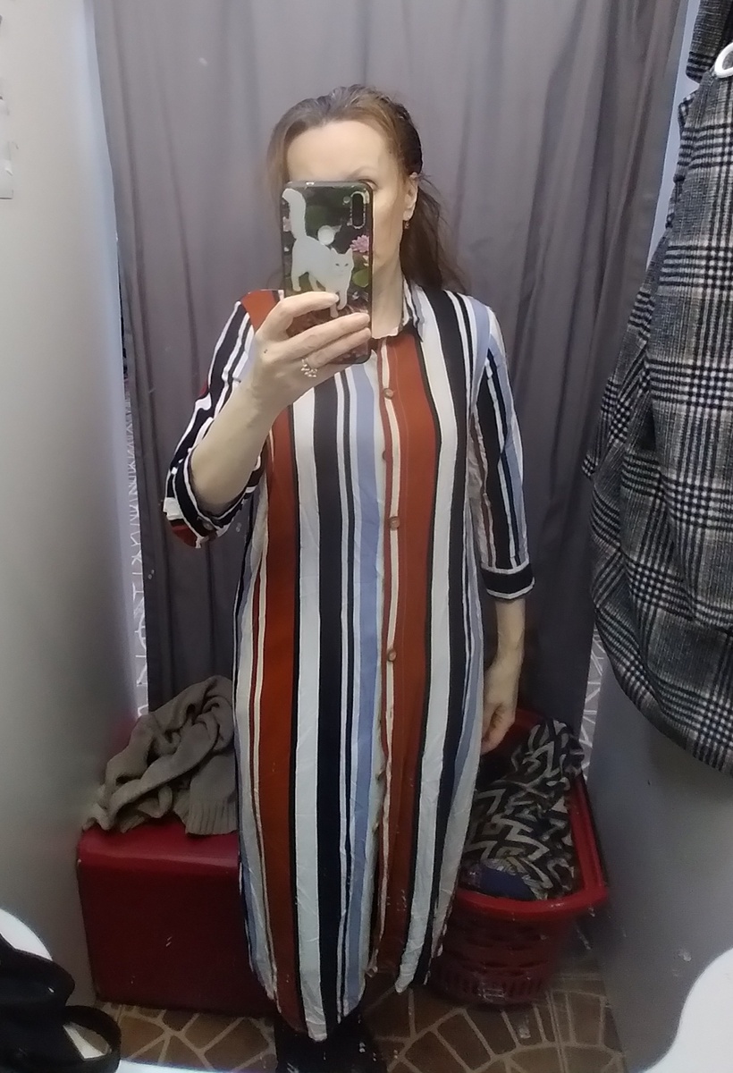 Здравствуйте, ну не виноватая я, они сами сделали распродажу, недавно ценопад был в одном секонде, теперь в другом. В этом магазине большие распродажи бывают редко и они более растянуты. Сначала было всё по 200, по 150 рублей и я их прогуляла, даже не прогуляла , а отсутствовала по уважительным причинам. На "всё по 100" успела заскочить, но всё по быстренькому. Сколько раз я себе говорила, что платьев у меня предостаточно, что обеспечена я ими под завязку и еще немного выше, я била себя по рукам, я зажмуривалась и уговаривала себя не тянуть ручонки к платьям(. Но видимо я впадаю в транс и уже не контролирую свои действия. Вот этого полосатика я купила, не устояла. Но если учесть , что такие платья и дома ношу, и на улице, и на даче, то может и пригодится. Полосатик с рукавами 3/4. В комплекте с биркой имеется запасная пуговица. Платье с воротником стойкой и драпировкой. Ткани не пожалели драпировка богатая. Платье для нельзяграмма? Полупальто с бежевой отделкой и большим воротником, ч