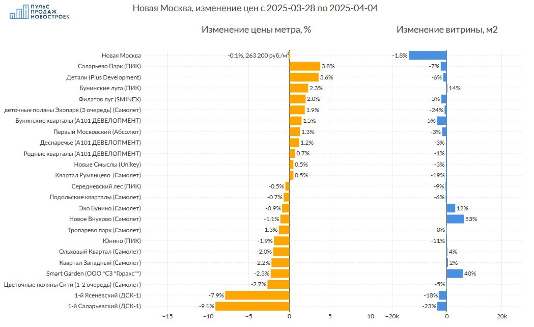 Новая Москва, обзор изменения предложения на рынке за неделю 💰 Смотрим без премиум и элит классов, лоты до 100м2, ЖК с изменением более 0.5%. 💵 За 7 дней цена метра снизилась на -0.1% до 263 200 рублей за метр. 📈Топ изменения цен (подорожало): 1️⃣ЖК "Саларьево Парк" (ПИК) цена метра +3.8%, витрина предложения уменьшилась на -2258м2 2️⃣ЖК "Детали" (Plus Development) цена метра +3.6%, витрина предложения уменьшилась на -1350м2 3️⃣ЖК "Бунинские луга" (ПИК) цена метра +2.3%, объем витрины при этом увеличился на 43м2 🪫Анти топ (подешевело): 1️⃣ЖК "1-й Саларьевский" (ДСК-1) -9.1% в цене, витрина предложения уменьшилась на -3522м2 2️⃣ЖК "1-й Ясеневский" (ДСК-1) -7.9% в цене, витрина предложения уменьшилась на -2903м2 3️⃣ЖК "Цветочные поляны Сити (1-2 очередь)" (Самолет) -2.7% в цене, витрина предложения уменьшилась на -186м2 Объем предложения жилья в регионе за неделю снизился -1.8% (-13900 м2) Все изменения в регионе на картинке. 🔥 @pulsprodaj