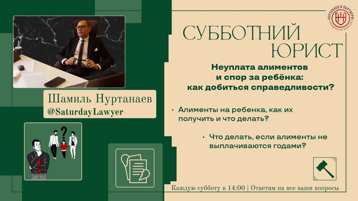 ⚡️⚡️⚡️⚡️Неуплата алиментов и спор за ребёнка: как добиться справедливости? Об этом и о многих других вопросах мы поговорим завтра 5 апреля на очередной трансляции "Субботнего Юриста" ⚖️ Эфир проведет юрист с более, чем 20 летней практикой – Шамиль Нуртанаев (нажав на имя вы можете узнать о юристе больше). Тема эфира: "Семейные споры" 📝 Вот основные вопросы, которые мы обсудим в эфире: 1. С кем останется ребёнок после развода, и как повлиять на решение суда? 2. Что делать, если алименты не выплачиваются годами? Также, каждый может задать свой вопрос любым удобным для вас способом, перейдя по ссылке: https://clck.ru/3ByDxh Или же просто напишите вопрос в комментариях к посту Получите юридическую консультацию, не выходя из дома! 🎥 Записи эфиров на нашем Rutube: https://rutube.ru/channel/40148985/ VK Видео: https://vk.com/video/@vk.nurtanaev Дзен: https://clck.ru/3DQGpA ✅ Присоединяйтесь к эфиру 5 апреля 2025 года в 14:00, будет интересно: https://t.me/SaturdayLawyer