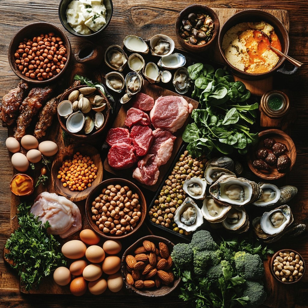 Создано на основе запроса: realistic image of a dining table spread of beef, chicken, clams, eggs, oysters, lentils, peas, tofu, broccoli, dark leafy greens, almonds, cashews