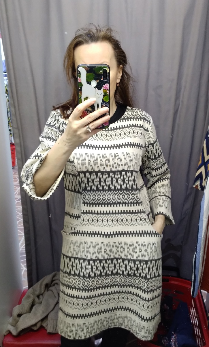 Здравствуйте, а заметили, что с благословления Дзена такие скромные кнопочки с правой стороны появились? Я с сомнением хмыкала. Муж сказал, что пусть будет, ты мол стараешься, бегаешь по секондам в любую погоду, а могла бы с чаем и компом кайфовать в тепле)). Я сразу вспомнила девиз американских почтальонов "ни снег, ни дождь, ни жара, ни мрак ночи не помешают", это же почти как я, а что поделать ведь в моем случае охота пуще неволи. Так что мой муж ждёт донатов)), он вообще невероятный оптимист. Я тоже жду, но мне сын обещал кинуть денежку, поддержать меня. Вот я и жду))🤪😜 Второй обзор с акции "всё по 100 рублей" в секонде. Немного приталенное платье. Такая ткань мне всегда напоминает мебельную обивку, несколько грубоватую и жёсткую. Платье нравится и принт тоже, а вот ткань скорее нет. Джинсовое платье немного приталенное и с накладными карманами. Село неплохо, горловина оттопыривается, это я молнию не смогла до конца застегнуть. Но почему-то эта бахрома напомнила мне новогоднюю ми