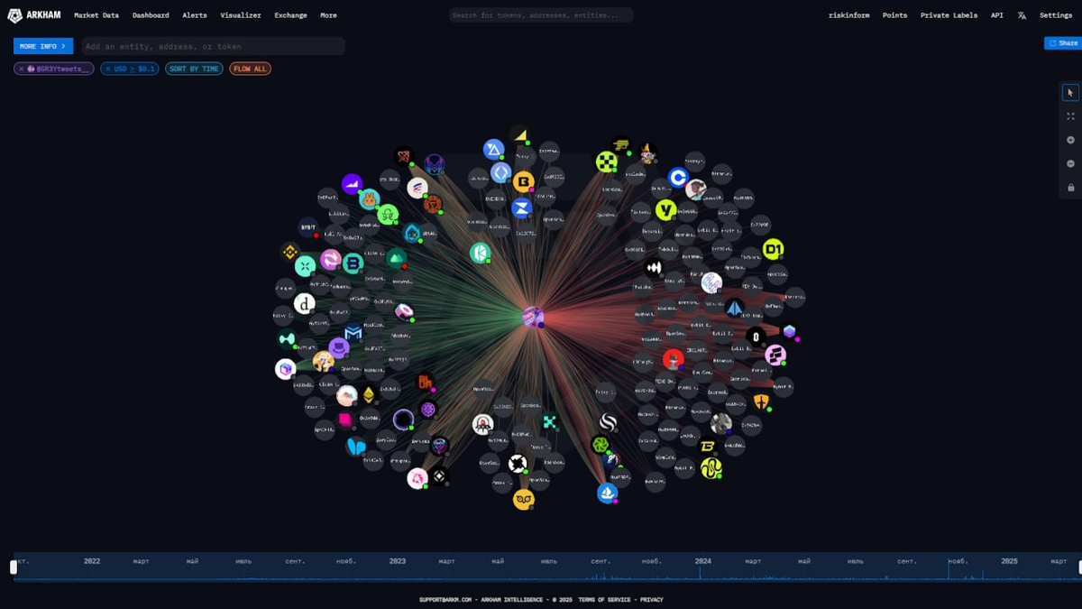 🔤 Arkham Intelligence Платформа систематически анализирует и деанонимизирует транзакции блокчейна, показывая пользователям людей и компанию, взаимодействующих с ним. В основе Arkham лежит Ultra — собственный алгоритмический ИИ-механизм, который позволяет собирать информацию в больших масштабах. Технология собирает офчейн- и ончейн-данные из разных источников и блокчейнов и связывает адреса в блокчейне с реальными субъектами, предоставляя полную информацию о том, кто и как использует криптовалюту. Работает с большинством блокчейнов, имеет потрясающие аналитические возможности по отслеживанию транзакций, в том числе в рамках DeFi-проектов. 🍪 Поддержать канал 📱 НАШИ КОНТАКТЫ #OSINT #DEFI #BLOCKCHAIN