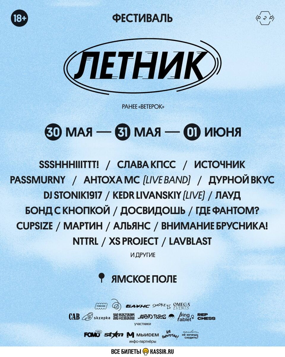 ЛЕТНИК © 2025 — твой первый фестиваль лета ✨ 30 мая - 01 июня «ЛЕТНИК – это фестиваль, который задает ритм всему лету. Это три дня абсолютной свободы, музыки и движа, где день перетекает в ночь, а ночь — в новое утро» Фестиваль, который раньше был известен как ВЕТЕРОК, выходит на новый уровень и возвращается в 2025 году под новым именем — ЛЕТНИК. Это трехдневный музыкальный праздник, который растянется на всю территорию Ямского поля, превратив её в огромную фестивальную зону с 5 сценами и почти 100 артистами. Днем — сотни активностей, интерактивные зоны и лайв-выступления, ночью — вечеринки до рассвета. Это не просто фестиваль — это старт самого беззаботного сезона в формате non-stop, где каждый день заканчивается на рассвете. И так три дня подряд. Музыкальная программа: Пять сцен — пять уникальных вайбов. Каждую неделю новые анонсы, среди первых: ssshhhiiittt!, СЛАВА КПСС, источник, passmurny, Антоха MC (LIVE BAND), Дурной Вкус, DJ Stonik1917, ЛАУД, Kedr Livanskiy (LIVE), Бонд