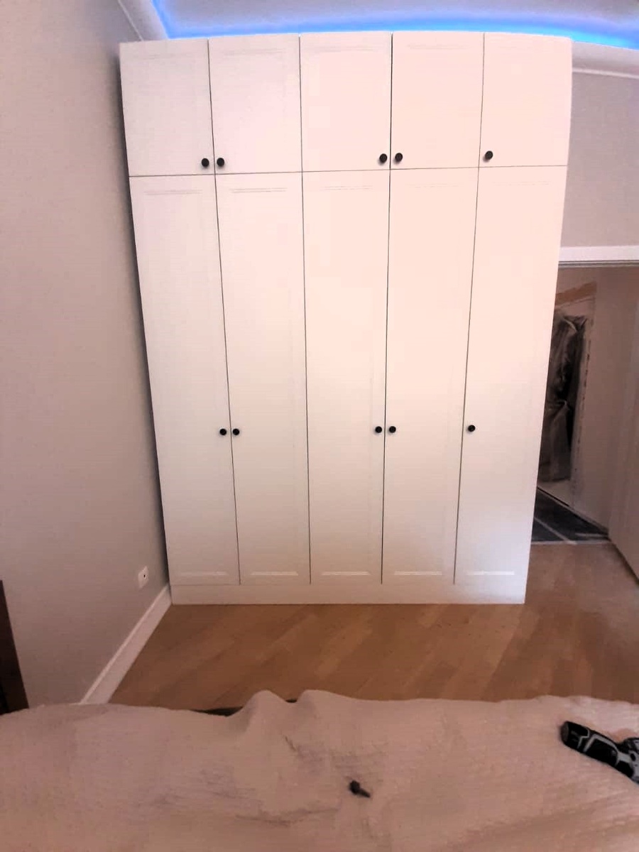 Шкафы высотой в 3 метра делаются из двух частей. Основного корпуса шкафа и отдельно антресоли.Сначала собирается основной шкаф,потом на него закидывается антресоль и вместе потом стягивается.После этого прибивается задняя стенка и всё крепится к стене.Такие шкафы можно делать с дверьми купе и с распашными фасадами как на фото.