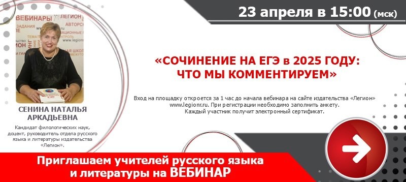 Вебинар "Сочинение на ЕГЭ в 2025 году: что мы комментируем" Дата: 23.04.2025 (Чт) Время: 15:00 Лектор Сенина Наталья Аркадьевна - кандидат филологических наук, доцент, руководитель отдела русского языка и литературы издательства «Легион». Участие бесплатное. Требуется регистрация на сайте издательства Подписывайтесь на наш официальный ТГ-канал