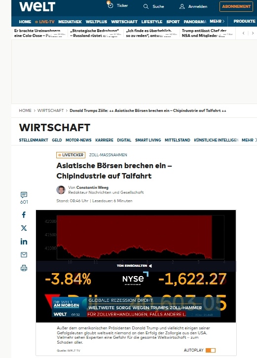 Немецкое издание WELT посвятило материал оценке влияния введенных Дональдом Трампом пошлин на и без того кризисную немецкую экономику. Министр экономики ФРГ Роберт Хабек назвал произошедшее «самым резким повышением за 90 лет». По оценке Хабека масштабные тарифы на импорт сравнимы по последствиям с началом войны на Украине и газовым кризисом после подрыва «Северных потоков». Хабек отметил, что пошлины подрывают глобальную торговлю и особенно сильно ударят по немецким компаниям, поскольку Германия сохраняет наибольший профицит в торговле с США. Тарифы, которые Трамп назвал «взаимными», составляют для Европейского союза 20%. Новый пакет включает до 50% пошлин в отношении отдельных государств. По словам главы Белого дома, США «больше не будут терпеть экономическое разграбление» и готовы к «экономической борьбе». На фоне новостей фондовый рынок США отреагировал резким падением. Индексы Dow Jones, Nasdaq и S&P 500 показали крупнейшее снижение с сентября 2024 года. В Баварии заявили, что пош