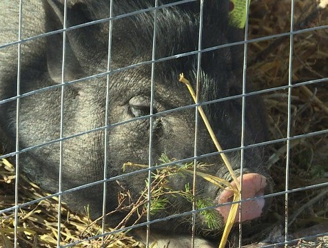 Свинья-беглянка, пойманная в Калуге, ждет своего хозяина в центре "Феникс