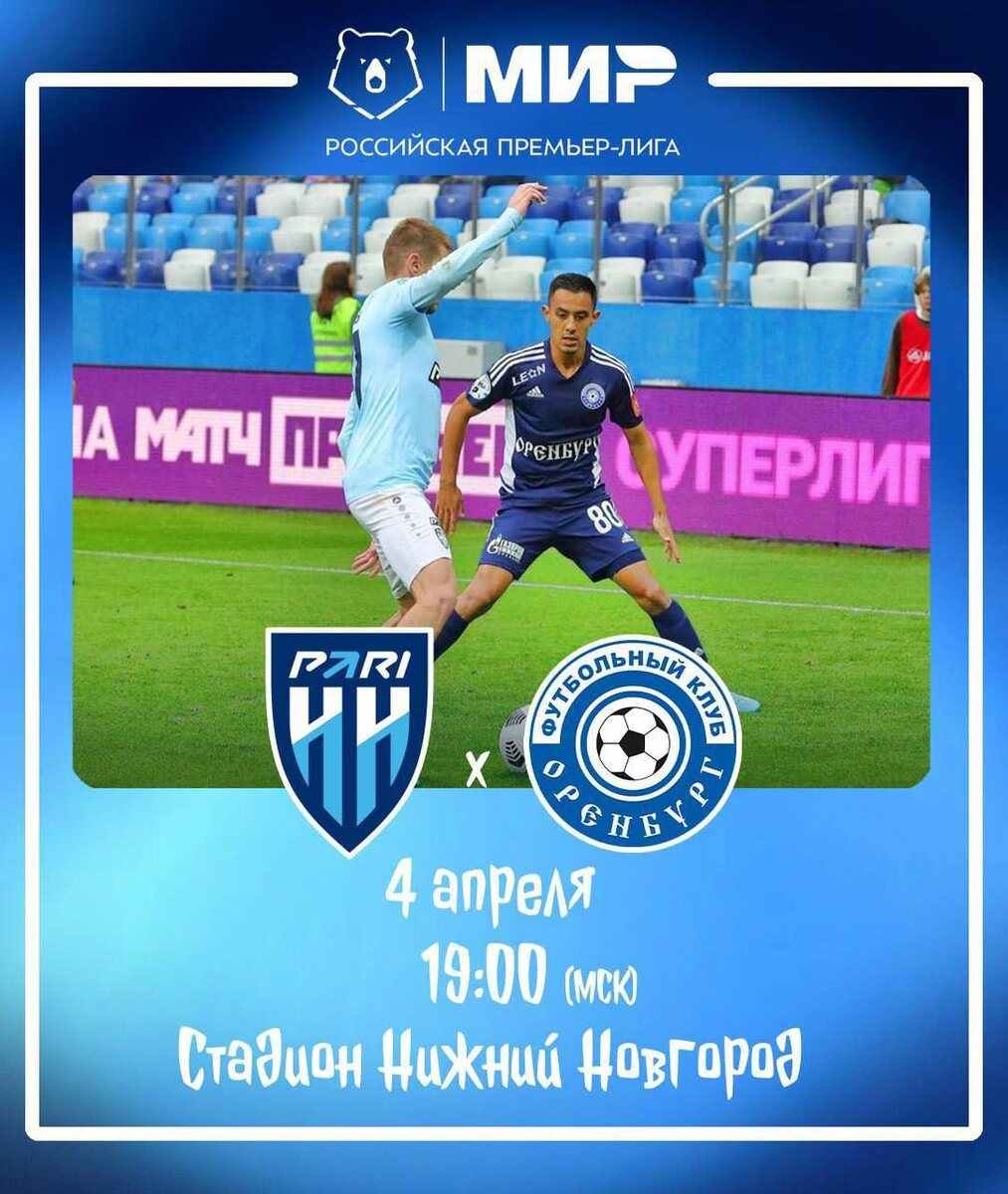⚽️Нижний Новгород vs Оренбург Уже в эту пятницу наша футбольная команда «Оренбург» сразится на стадионе в Нижнем Новгороде с командой «Пари НН»! 🕒 Когда? 04 апреля в 19:00 по Московскому времени 📍Где? : Стадион «Нижний Новгород» Хотите увидеть матч в приятной компании семьи и друзей? Обсудить стратегию игры? Или просто поддержать команду? Не упустите возможность стать частью этого важного матча! Присоединяйтесь к нам в баре «Harat’s» или отправляйтесь на сам стадион, чтобы ощутить настоящий футбольный праздник!⚽️ 💙 🤍Создадим невероятную атмосферу поддержки для нашей команды вместе! #ПоддержимНашуКоманду #Футбол #ВместеКПобеде #ФутбольныйПраздник #СемьяИДрузья Конкурсная работа №3
