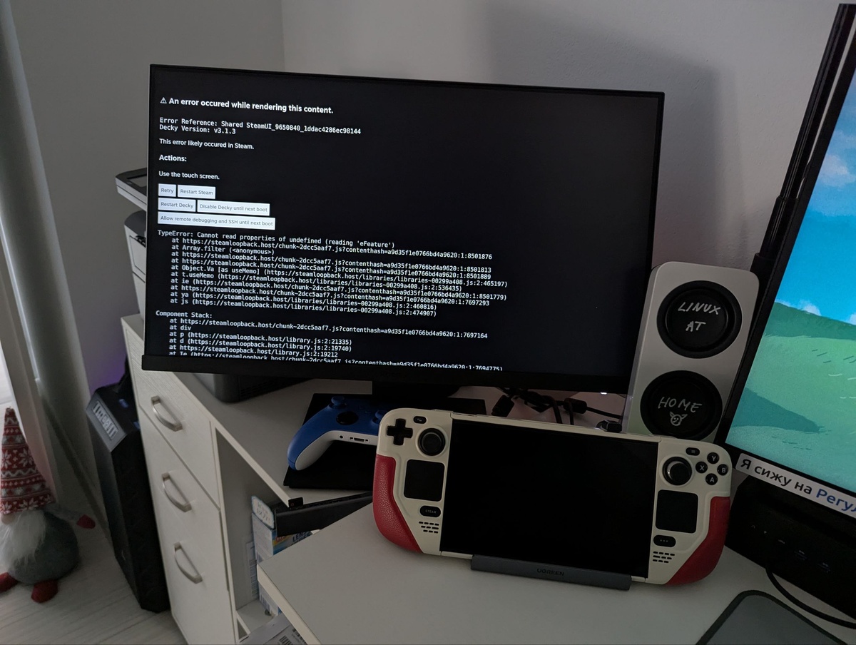 ~ За всё время эксплуатации впервые такой косяк после апдейта на Steam Deck Проблема на самом деле даже не в SteamOS, а в том что свежий апдейт сломал сторонний костыль в лице Decky Loader. Лечится довольно просто: 01. Выбираем пункт Disable Decky until next boot 02. Переходим в режим рабочего стола 03. В консоли вбиваем: curl -L https://github.com/SteamDeckHomebrew/decky-installer/releases/latest/download/install_release.sh | sh 04. Перезагружаем устройство. Версия была v3.1.3 стала v.3.1.5 и теперь всё работает ровно. Нужно учитывать, что я вообще невнимательный к апдейтам пользователь последнее время и возможно я несколько раз игнорировал призыв плагина обновить себя. Ещё бывает что частенько обновления SteamOS полностью удаляют Decky Loader и нужно повторять его установку всё той же командой выше. Подробнее тут: Reddit @plafon #steamdeck