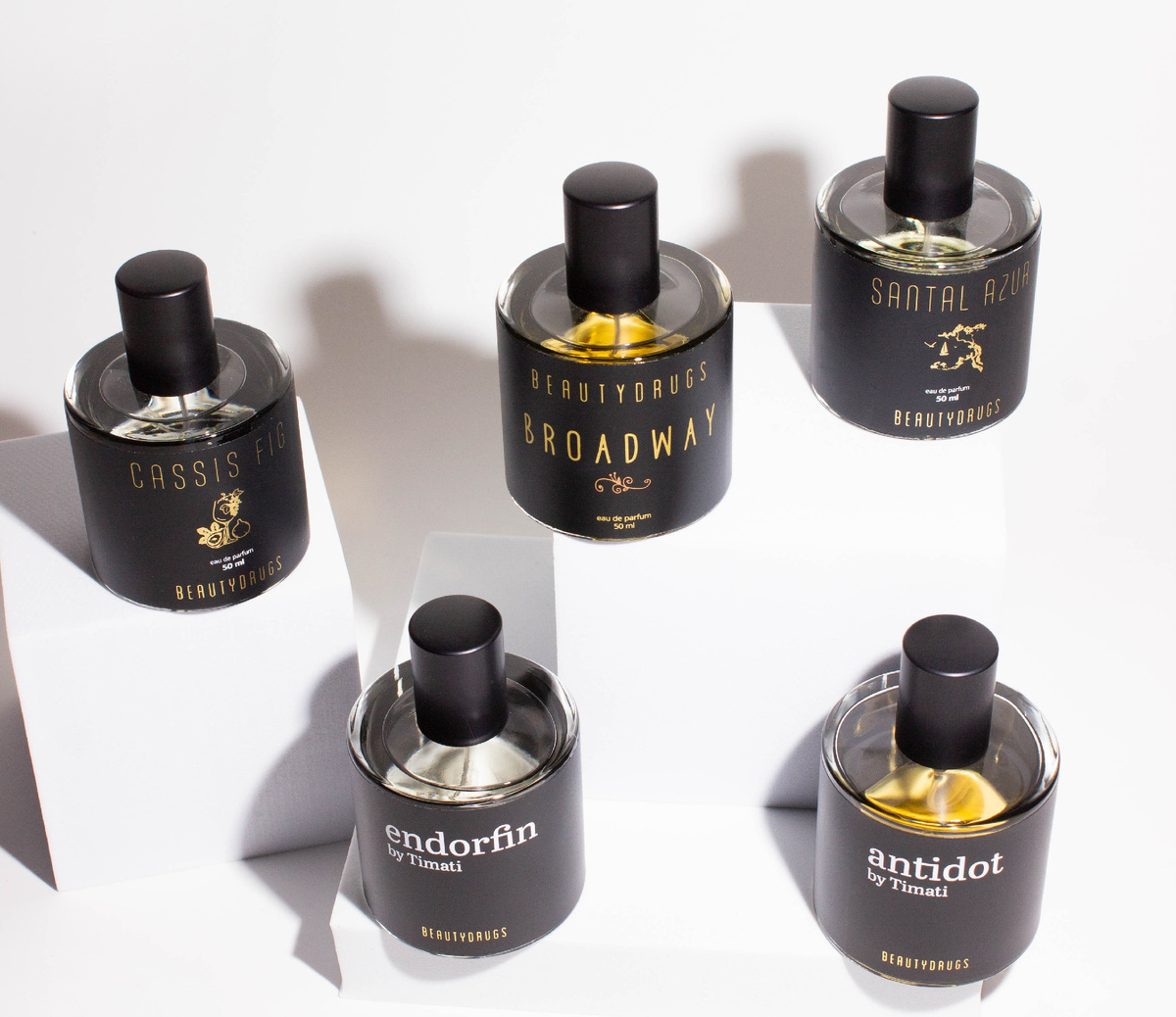 На данный момент в линейке Beautydrugs представлено пять ароматов, каждый из которых посвящен определенному настроению и воспоминанию. Два аромата из линейки (Endorfin и Antidot) были созданы в коллаборации с известным российским рэп-исполнителем Тимати и являются парфюмерным и оригинальным прочтением женственности и мужественности во флаконе. Это парфюмы, пробуждающие яркие эмоции и вызывающие улыбку на лице.