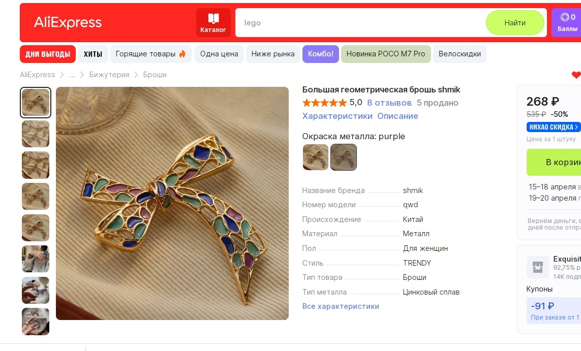 Какие новинки сейчас доступны на популярной азиатской платформе? Наша задача – уметь распознавать копии и их отличия от настоящих украшений. Самое важное – избежать приобретения реплики по стоимости оригинала. Эпизод 1 В продаже брошь в виде бантика. Она представлена в разных цветовых вариантах. Посмотрим на них внимательно. Приятные броши, сделаны неплохо. Информацию о размерах продавец не представил. Обороты брошей выглядят вот так. Застежка имеет тонкую иглу, но замок уже другой, чем у большинства брошей этой азиатской площадки. Броши без маркировки. Эти броши - копии брошей бантиков, которые являются частью коллекции "Modern Mosaic" компании Trifari , которая впервые была представлена в каталоге осень-зима 1966. Вот страница этого каталога. Размер оригинала - 7 х 8 см. Брошь выпущена в самых разных цветовых вариантах. Листайте карусель. И вот оборот этих брошей: маркировка, характерная для украшений компании Trifari того времени, и прочная игла застежки. Оригинал броши как часть