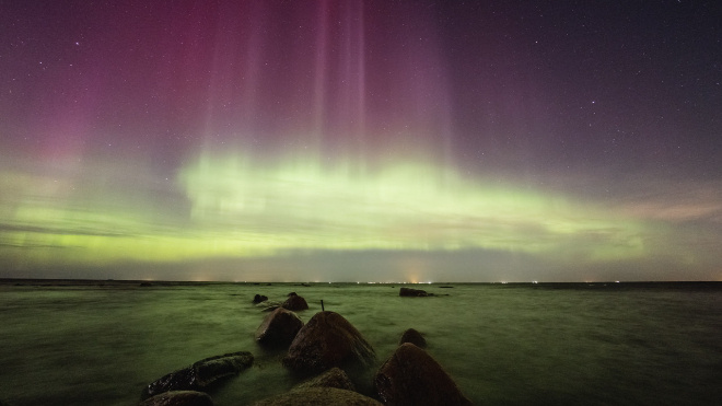 Над штормовым Финским заливом в Ленобласти ночью бушевало северное сияние