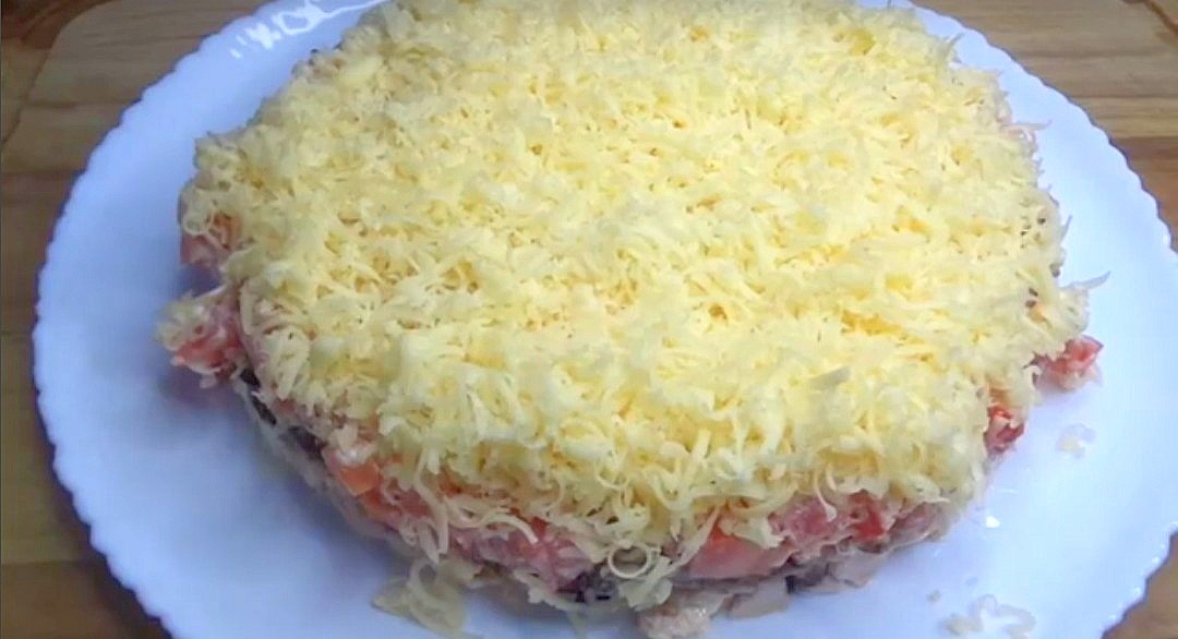 - Последним слоем выкладываем натертый на мелкой терке сыр, разравниваем.