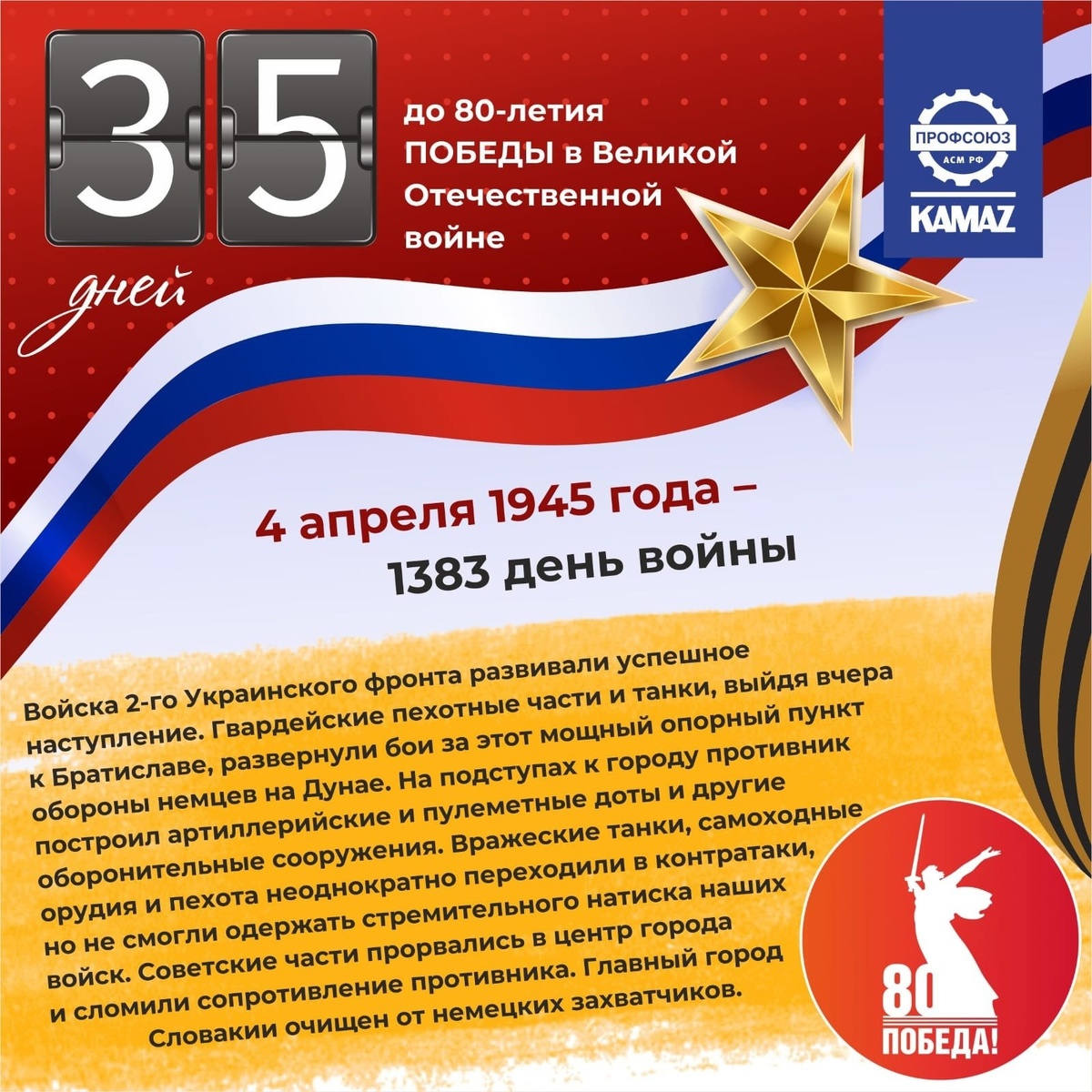 Войска 2-го Украинского фронта развивали успешное наступление. Гвардейские пехотные части и танки, выйдя вчера к Братиславе, развернули бои за этот мощный опорный пункт обороны немцев на Дунае. На подступах к городу противник построил артиллерийские и пулеметные доты и другие оборонительные сооружения. Немцы сосредоточили в районе города четыре пехотные дивизии, ряд специальных подразделений, бригаду штурмовых орудий и оказывали упорное сопротивление. Штурм города начался артиллерийской и авиационной подготовкой. Следуя за огневым валом артиллерии, наши бойцы ворвались на восточные окраины Братиславы и отвлекли на себя основные вражеские силы. Тем временам другие советские части продвинулись по восточным склонам Малых Карпат и нанести удар с севера. Завязались ожесточенные уличные бои. Вражеские танки, самоходные орудия и пехота неоднократно переходили в контратаки, но не смогли одержать стремительного натиска наших войск. Советские части прорвались в центр города и сломили сопротивление противника. Главный город Словакии очищен от немецких захватчиков.