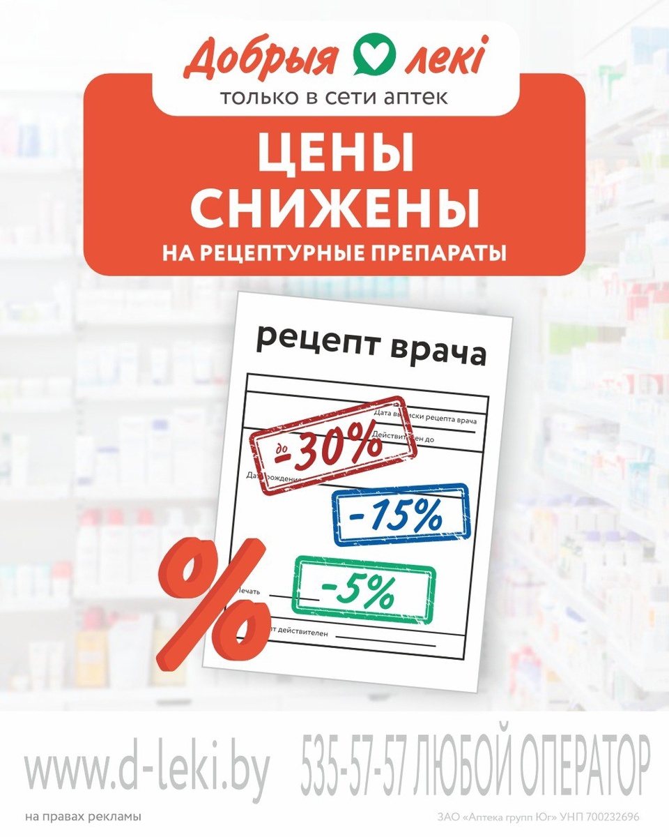 📌Цены снижены на рецептурные препараты в аптеках “Добрыя лекі” Сеть аптек «Добрыя лекi», одна из крупнейших в Беларуси, запустила уникальное предложение. ✔️С 20 марта по 30 апреля 2025 года клиенты сети смогут сэкономить до 30% на товарах, отпускаемых по бумажному или электронному рецепту. ▶️Кроме того, в сети аптек действует бонусная программа лояльности «аптечка+». Бонусы начисляются на каждую покупку, в том числе и на товары со сниженными ценами. Это отличная возможность получить дополнительные бонусы, которые можно использовать для будущих покупок. Подробные условия программы лояльности вы можете найти на сайте www.d-leki.by или уточнить в любой из аптек сети. "Добрыя лекі" – добрыя людзі, якія заўседы побач! 📍📍@Пинский Вестник ЮТУБ | САЙТ| ИНСТ | ВК | ОК | ФЕ | Прислать новость
