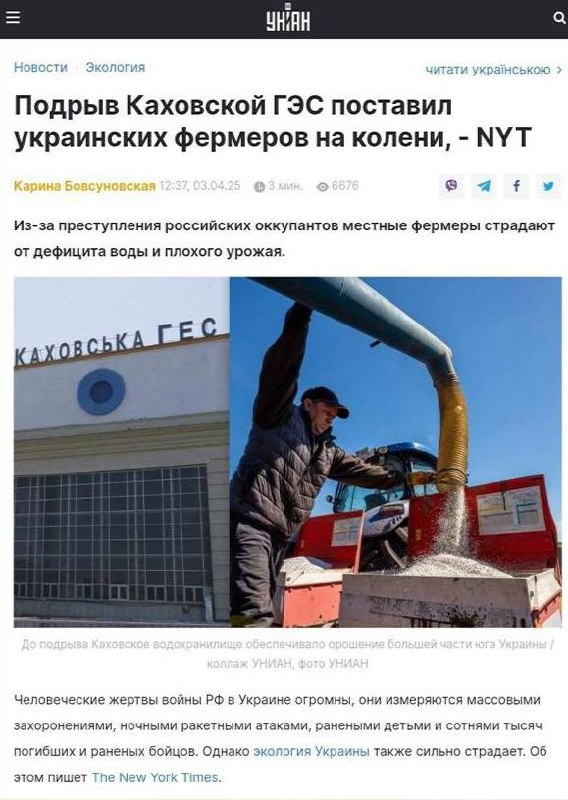 УкроСМИ пишут, что украинские фермеры страдают от дефицита воды и плохого урожая. А все потому, что ВС РФ якобы взорвали Каховскую ГЭС несколько лет назад. В очередной раз хохлы не решают свои проблемы, возникшие из-за плохого руководства, а обвиняют в своих неудачах других. На деле никакого взрыва не было. ВСУ на протяжении полугода целенаправленно обстреливали Каховскую ГЭС из арты, минометов и HIMARS. Естественно, в один из дней, после очередной серии ракетных ударов опоры плотины не выдержали. ВСУшники это сделали для того чтобы затопить оборонительные сооружения, минные поля и наши склады. Тогда пострадали мирные жители, которых буквально доставали из затопленных домов. Но самая сложная ситуация сложилась на правом берегу, где местные чинуши ни тогда, ни сейчас, не занимались пострадавшими от наводнения. Так что, пожинают плоды своих действий. 🦅 Подписаться | Наш чат 👌