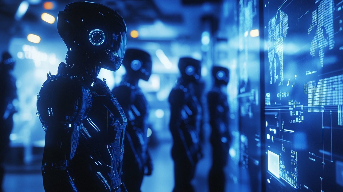 Создано на основе запроса: A group of diverse humanoid AI robots or digital agents standing still in a futuristic high-tech control center