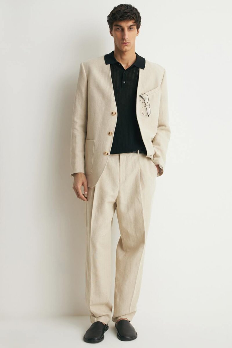 Идея модного сочетания для теплой погоды от стилистов LIMÉ: льняной костюм из прямых брюк и однобортного блейзера с V-образным вырезом в