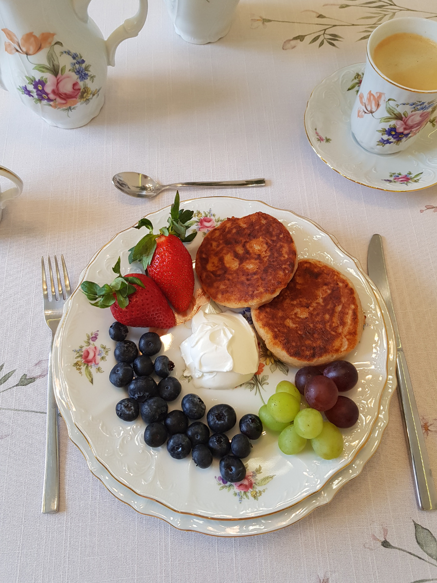 Доброе утро, дорогие друзья! Сегодняшнее ветреное и дождливое утро я предлагаю начать ароматным и сытным завтраком из сырников с добавлением муки из полбы, которая придает блюду ореховый вкус. Для приготовления нам понадобятся: 500 грамм творога жирностью 5%, 100 грамм муки из полбы (80 грамм добавляем при замешивании, 20 грамм оставляем для формирования сырников), 2 яйца, 30 грамм аллюлозы, 3 грамма ванильного сахара, 3 грамма соды, 30 грамм подсолнечного масла. Для сервировки нам понадобятся: 200 грамм клубники, 200 грамм голубики, 100 грамм белого винограда, 100 грамм красного винограда, 120 грамм сметаны жирностью 10% Приготовления: Творог, аллюлозу, ванильные сахар, яйца поместить в чашу измельчителя. Измельчить ингредиенты и смешать их. Добавить соду, просеять муку, перемешать. Сформировать намоченными в воде плоские сырники, обвалять их в полбенной муке со всех сторон. На разогретую сковородку налить растительное масло, выложить сырники и жарить на среднем огне 3 минуты.