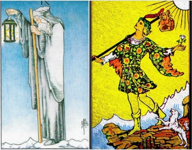 «...Белое солнце светит на него, но он поворачивает спину его сиянию. Вместо этого он обнимает жёлтое небо. Мы видим только треть сверкающего белого света. Он исходит из правого угла карты, что означает, что ему еще не всё открыто. Тем не менее, у него есть энергия и детская живость, открывающая чудеса жизни. Расположение солнца важно в эзотерическом учении, так как оно представляет духовное солнце, которое никогда не заходит. Таким образом, оно не может достичь своей высшей точки. Оно никогда не заходит. Оно вечно. Угол составляет 45°, что равно числу 9 (длина дуги, на которую этот угол опирается, равная 9 см). Число 9 представляет высшую степень духовности, которую человек может достичь за жизнь. Отшельник, ключевая Карта 9, также стоит на высокой вершине. Возможно, это та самая вершина на заднем плане. Это определенно стоит размышлений...» Отшельник.