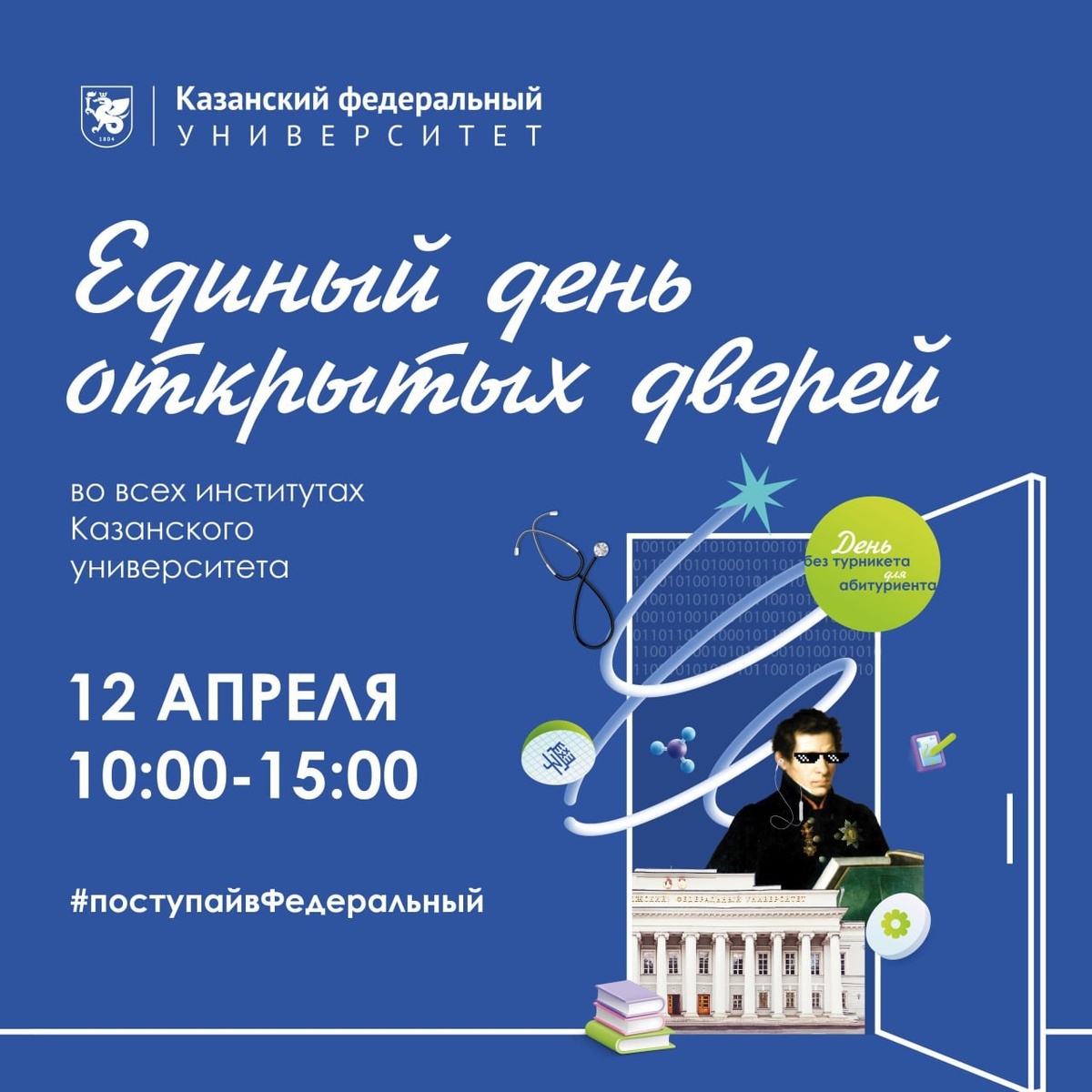 В КФУ пройдёт Единый день открытых дверей Впервые можно будет посетить все институты и факультеты КФУ: заглянуть в аудитории, научные лаборатории, встретиться со студентами и задать вопросы директорам, а также пообщаться с будущими работодателями. Это отличная возможность погрузиться в мир науки, узнать о возможностях и построить свою карьерную траекторию. В каждом институте КФУ вас ждут: 🔹Экскурсии: пройдите по кампусу и загляните в современные лаборатории. 🔹«Студенческие болталки»: пообщайтесь с яркими студентами - активистами и победителями олимпиад. 🔹Открытые диалоги с директорами: подготовьте вопросы для руководителя института, который рассматриваете для поступления. 🔹Научно-популярные лекции: почувствуйте себя студентом и посмотрите на преподавателей в деле. Формируйте персональную программу и приходите. 📆 12 апреля, 10:00 – 15:00 👉 Программа и регистрация по ссылке. #поступайвФедеральный. Реклама. ФГАОУ ВО КФУ @tatmediaofficial