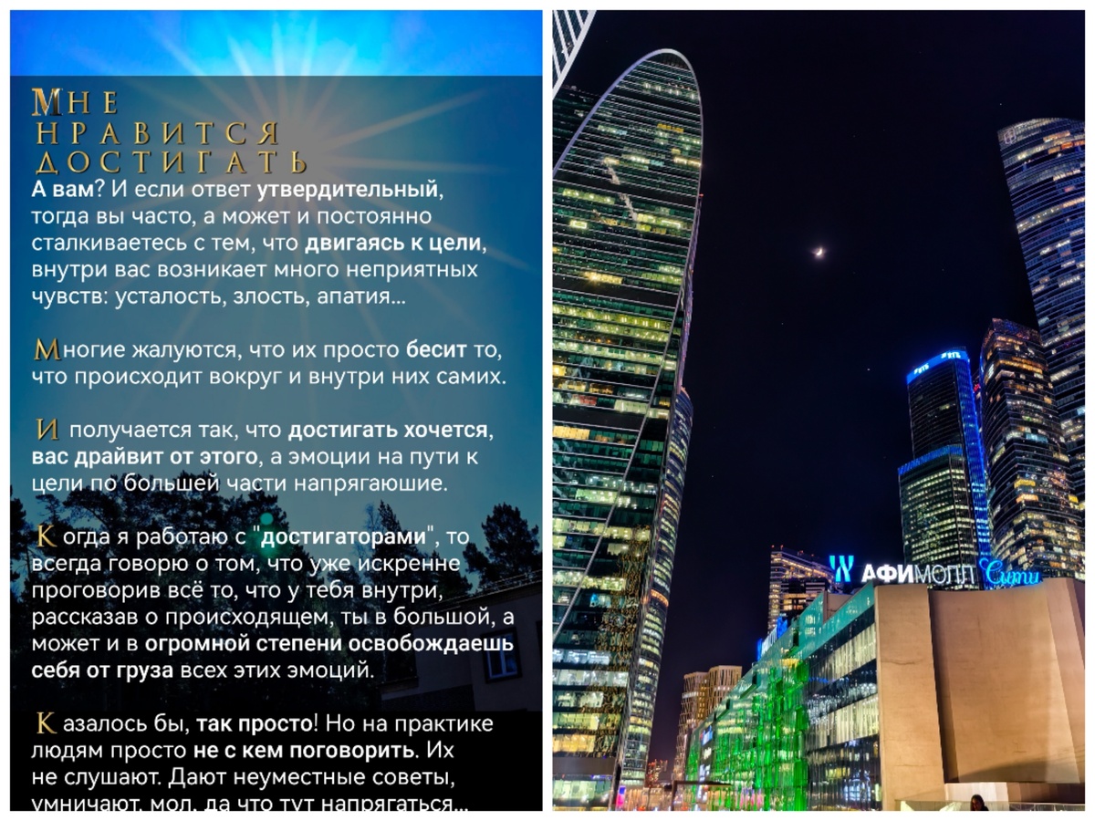 🪩Мне нравится достигать!🪩 ⭐️⭐️⭐️⭐️⭐️⭐️⭐️ А вам? И если ответ утвердительный, тогда вы часто, а может и постоянно сталкиваетесь с тем, что двигаясь к цели, внутри вас возникает много неприятных чувств: усталость, злость, апатия... Многие жалуются, что их просто бесит то, что происходит вокруг и внутри них самих. И получается так, что достигать хочется, вас драйвит от этого, а эмоции на пути к цели по большей части напрягающие. ⭐Когда я работаю с "достигаторами", то всегда говорю о том, что уже искренне проговорив всё то, что у тебя внутри, рассказав о происходящем, ты в большой, а может и в огромной степени освобождаешь себя от груза всех этих эмоций. Казалось бы, так просто! Но на практике людям просто не с кем поговорить. Их не слушают. Дают неуместные советы, умничают, мол, да что тут напрягаться... Поэтому я считаю мою работу очень ценным вкладом в жизнь людей. Со мной они могут говорить и выговариваться практически обо всём. И что ключевое, выговорившись, они не только облегчают
