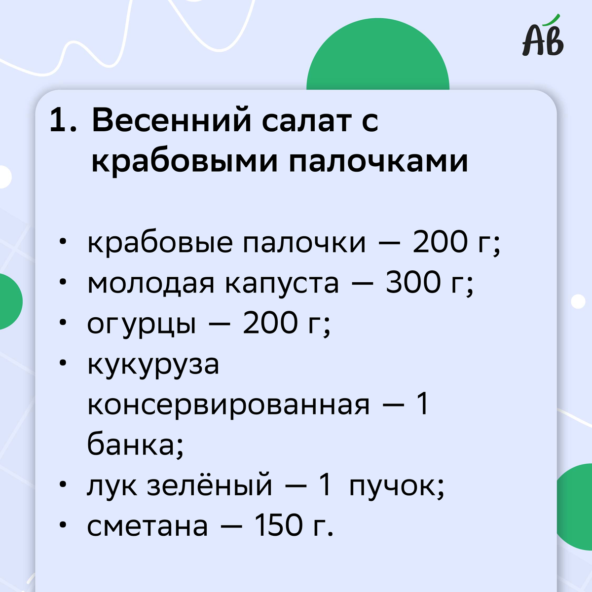 Продолжаем радовать вкусными и полезными блюдами! В этой части — ещё шесть интересных салатов: с яркими вкусами, необычными ингредиентами и простой подготовкой. Все продукты указаны в карточках, а пошаговое приготовление — ниже. Пусть весна будет не только за окном, но и в тарелке! 🥗 Весенний салат с крабовыми палочками 1️⃣ Тонко нашинкуйте капусту и слегка помните руками; 2️⃣ Нарежьте небольшими кубиками огурцы и крабовые палочки; 3️⃣ Мелко нарубите зелёный лук; 4️⃣ Откройте банку кукурузы и слейте сок; 5️⃣Смешайте все ингредиенты и добавьте консервированную кукурузу; 6️⃣Заправьте салат сметаной, при необходимости посолите. 🥗 Салат с молодыми помидорами и моцареллой 1️⃣ Нарежьте помидоры и лук крупными кубиками; 2️⃣ Измельчите базилик; 3️⃣ Нарвите руколу произвольно; 4️⃣ Перемешайте овощи и зелень, добавьте шарики моцареллы; 5️⃣ Добавьте специи и заправьте салат маслом и уксусом. 🥗 Салат из одуванчиков 1️⃣ Тщательно промойте листья одуванчика и замочите в подсоленной воде на 30 мин
