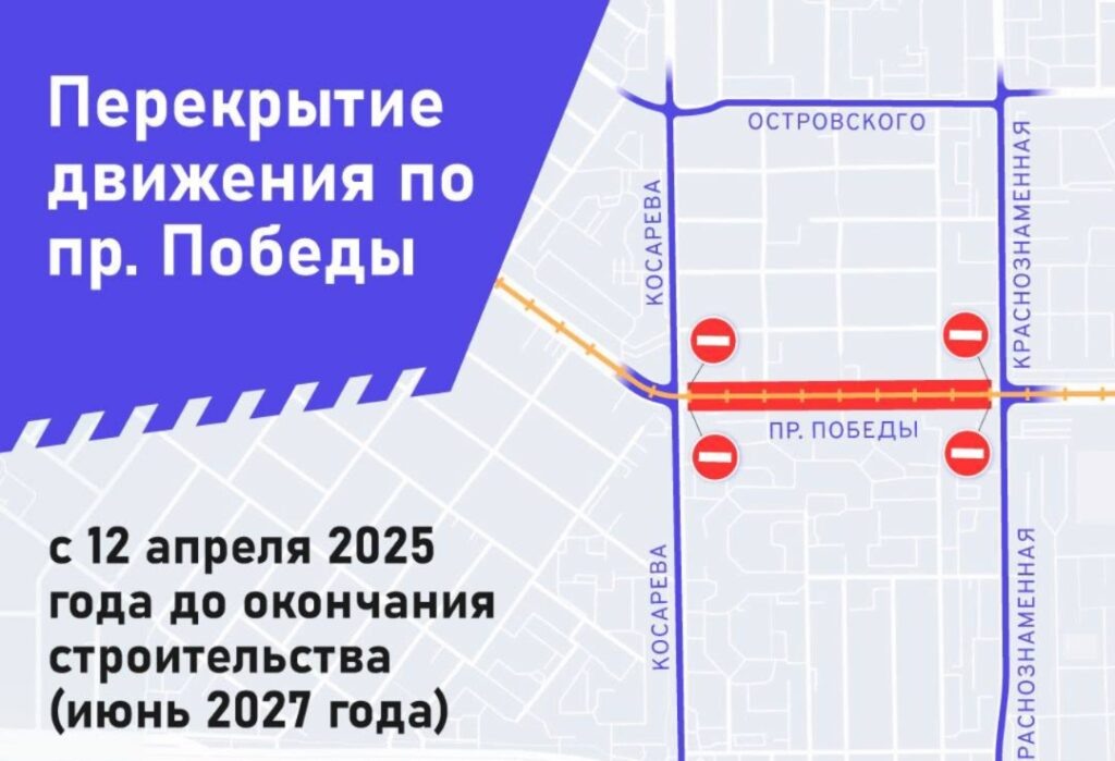 В Челябинске с 12 апреля полностью закроют движение автомобильного транспорта по проспекту Победы на участке Косарева – Краснознаменная. Как сообщили в региональном Миндортрансе, это необходимо для реализации проекта метротрама. На участке будут проводить работы по выносу коммуникаций, а также устройству стартового котлована для тоннелепроходческих комплексов. «Подрядная организация АО «Моспроект-3» уже приступила к выносу водовода и сетей наружного освещения на данном участке. В ближайшее время начнутся работы по переустройству ливневой канализации, трамвайных путей и контактной сети», – говорится в сообщении. Ограничения движения продлятся до окончания строительства – до июня 2027 года. Объезд организован по улицам Братьев Кашириных, Островского и Комсомольскому проспекту. Движение трамваев будет сохранено. Как сообщала «Правда УрФО», ранее «Моспроект-3» не смог найти подрядчика для проходки перегонных тоннелей в рамках проекта метротрама. Стоимость работ составляла 8,8 млрд рублей.