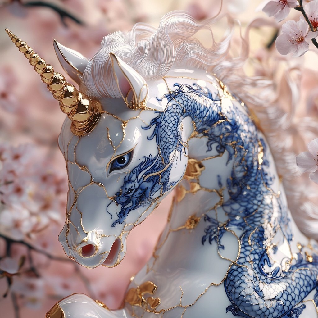 Создано на основе запроса: realistic porcelain unicorn with blue Japanese dragon design on it, broken being held together by gold with
