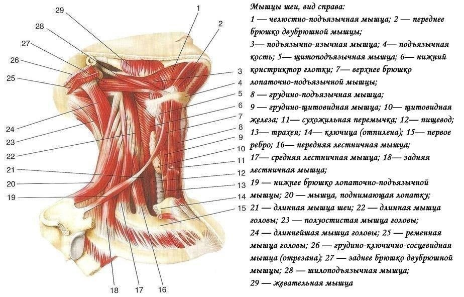 Мышцы и фасции: Подъязычная кость имеет многочисленные мышечные прикрепления: 1. Подъязычно-язычная мышца, идет от тела и большого рога подъязычной кости к боковым частям языка и заканчивается в слизистой оболочке. 2. Подбородочно-язычная мышца, идет от подбородочной ости нижней челюсти к верхнему краю тела подъязычной кости. 3. Подбородочно-подъязычная мышца, идет от подбородочной ости нижней челюсти к передней поверхности тела подъязычной кости. 4. Челюстно-подъязычная мышца, идет от одноименной линии на нижней челюсти к передней поверхности тела подъязычной кости. 5. Щитоподъязычная мышца, m. thyrohyoideus, идет от косой линии щитовидного хряща к нижнему краю большого рога. 6. Шилоподъязычная мышца, идет от шиловидного отростка височной кости, охватывает промежуточное сухожилие двубрюшной мышцы у места прикрепления к малому рогу подъязычной кости. 7. Двубрюшная мышца, идет от сосцевидной вырезки кдвубрюшной ямке нижней челюсти. Промежуточное сухожилие при помощи соединительнотканно