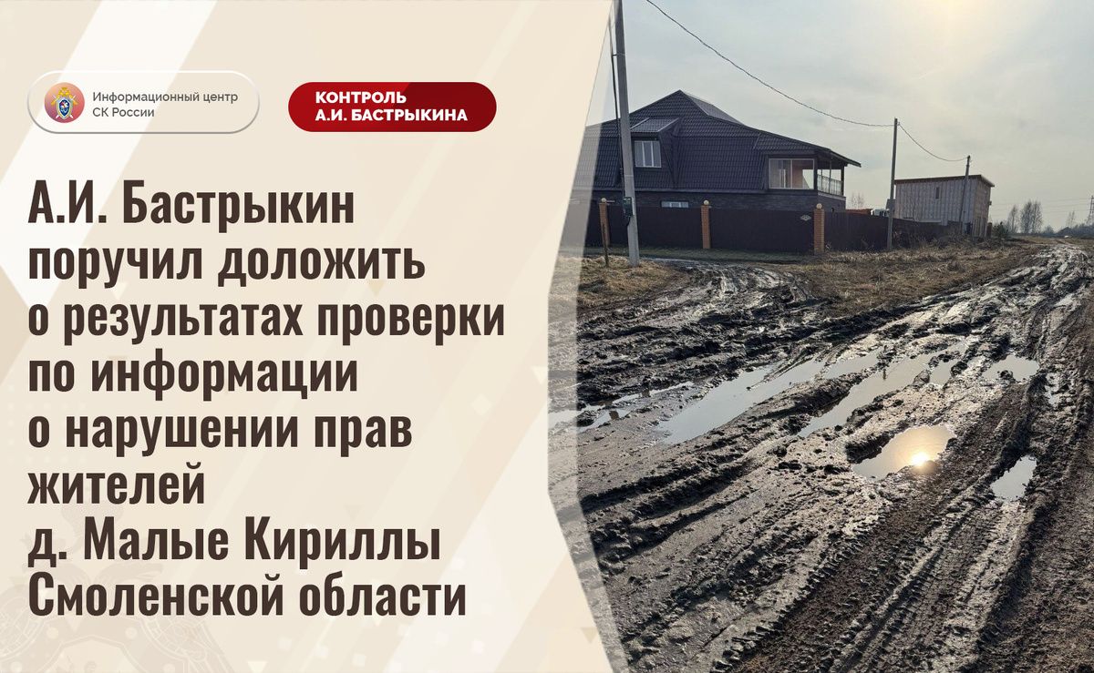А.И. Бастрыкин поручил доложить о результатах проверки по информации о нарушении прав жителей д. Малые Кириллы Смоленской области В СМИ и социальной сети сообщается, что единственная дорога, ведущая к жилым домам в деревне Малые Кириллы Смоленской области, находится в непригодном состоянии. Неасфальтированное полотно в период осадков размывает, в связи с чем проезд личных автомобилей граждан и спецтранспорта, в том числе скорой медицинской помощи, невозможен. Многочисленные обращения местных жителей результатов не принесли, меры к разрешению проблемы не принимаются. В СУ СК России по Смоленской области по данному факту организована процессуальная проверка. Председатель Следственного комитета Российской Федерации Александр Иванович Бастрыкин поручил руководителю СУ СК России по Смоленской области Анатолию Юрьевичу Уханову доложить о предварительных и окончательных результатах процессуальной проверки. Исполнение поручения, а также ход процессуальной проверки поставлены на контроль в цент