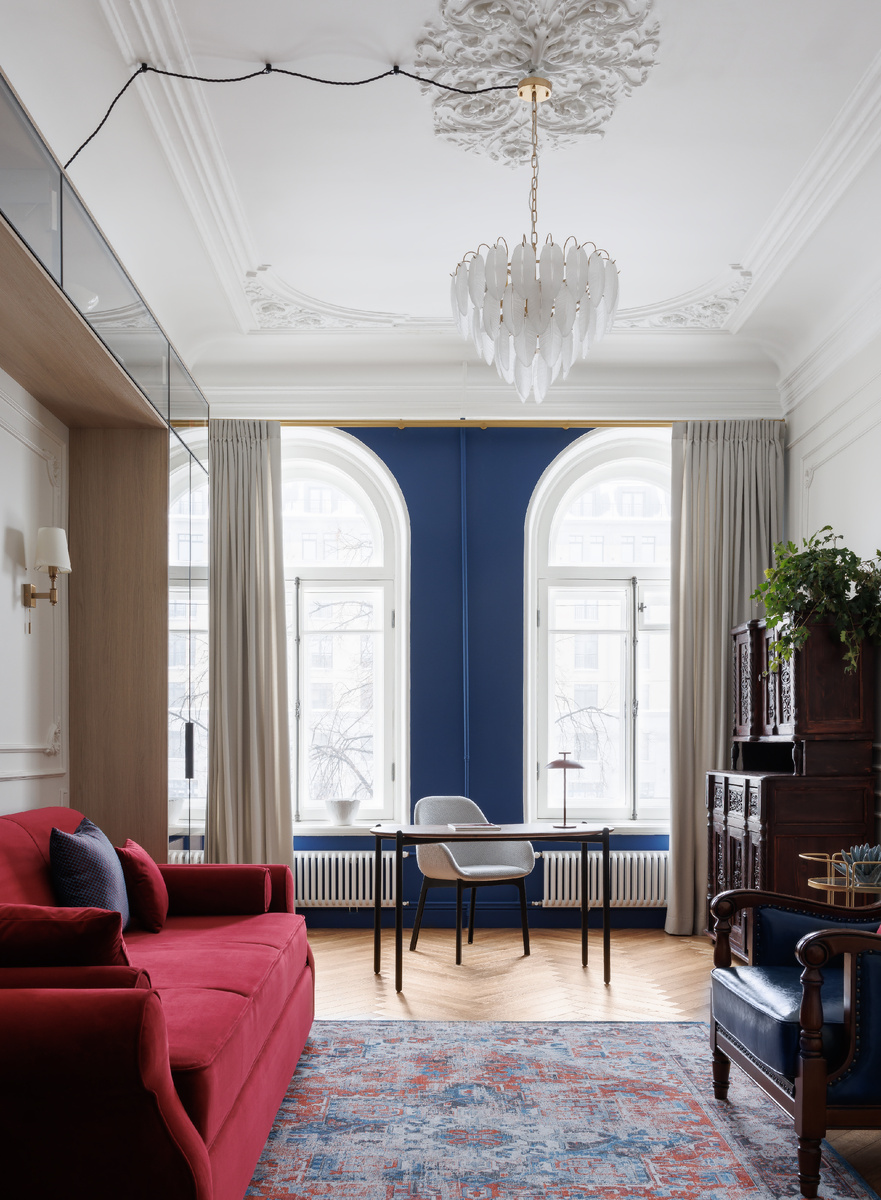 Дизайнер Марина Светлова создала особенное пространство из квартиры в историческом центре Петербурга на набережной Реки Карповки. «Мне приятно, что удалось восстановить сохранившиеся элементы убранства. Также я считаю, что квартира получилась приятная и легкая, интерьер не давит, а окружает,» — рассказывает дизайнер.