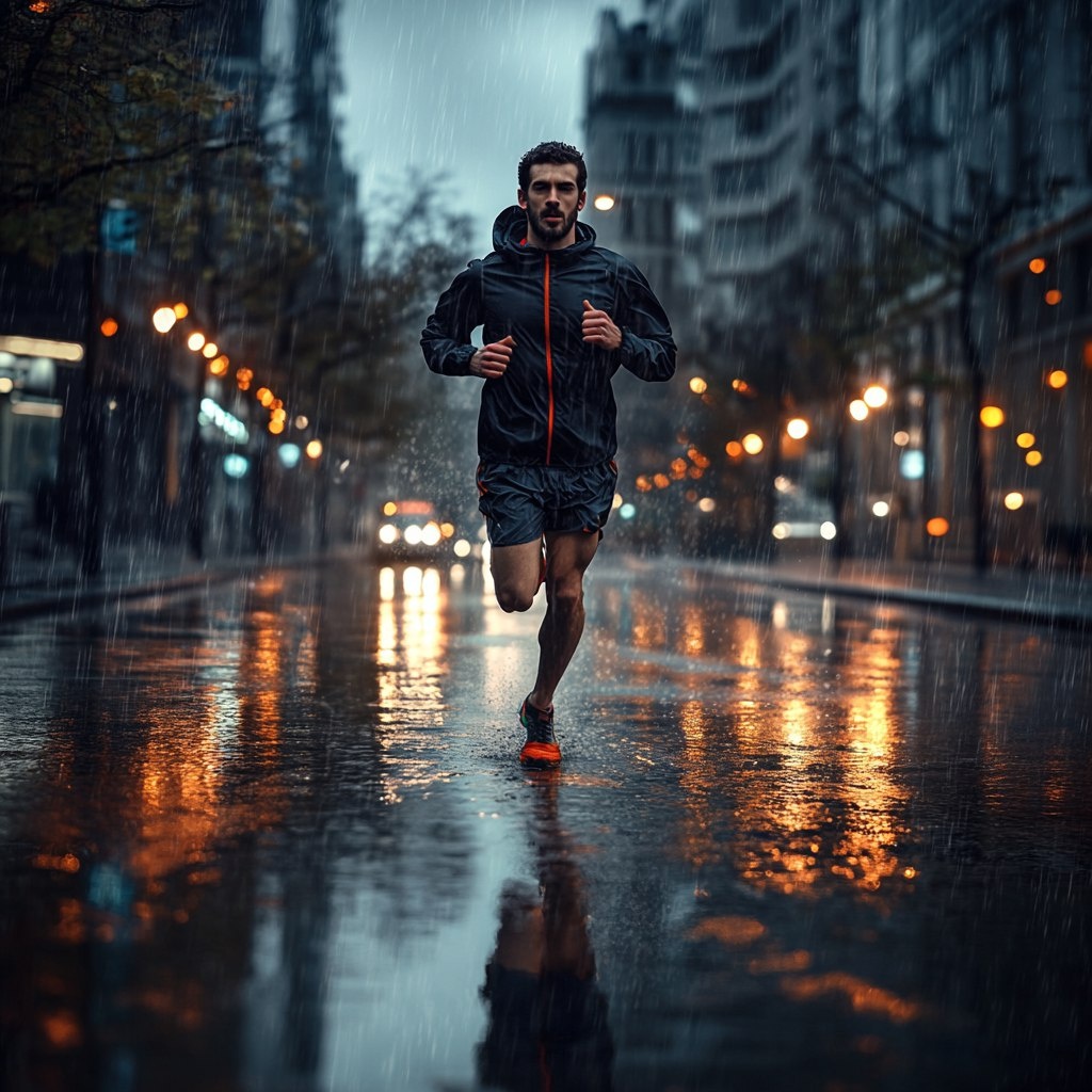 A photorealistic portrait of a runner sprinting through a rainy city at night, motion blur on street lights, dynamic angle, 35mm lens, cinematic lighting, hyper-detailed, Nikon D850