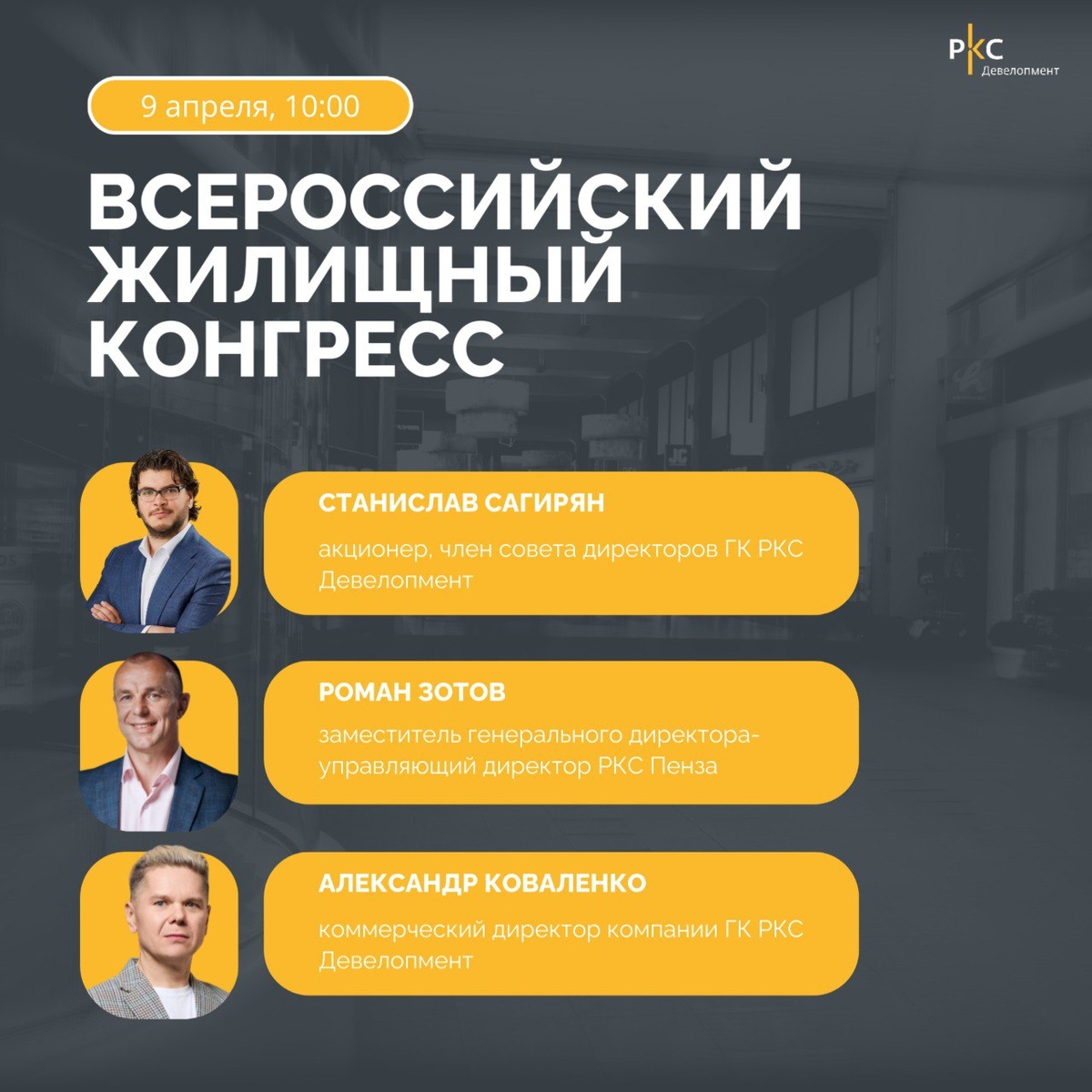 ⚡️Эксперты ГК "РКС Девелопмент" выступят на Всероссийском жилищном конгрессе в Сочи! С 7 по 11 апреля в Университете "Сириус" пройдет масштабное мероприятие, посвященное будущему рынка недвижимости. Наши спикеры поделятся ценными инсайтами и практическими инструментами в области продаж и региональной экспансии: 🟠Станислав Сагирян, акционер, член совета директоров ГК РКС Девелопмент, выступит с презентацией «Региональная экспансия девелопера в новых реалиях рынка» и расскажет, по каким критериям девелоперы выбирают регионы для развития. 🟠Роман Зотов, заместитель генерального директора-управляющий директор РКС Пенза, расскажет про так называемый «Пензенский феномен», сложившийся в сфере продаж в Пензенской области, и поделится особенностями реализации девелоперских проектов и продаж жилья в регионах». 🟠Александр Коваленко, коммерческий директор компании ГК РКС Девелопмент, презентует «уникальные лайфхаки продаж» на первичном рынке. ☑️ Дата: 9 апреля ☑️ Время: 11:30 – 13:00 📍