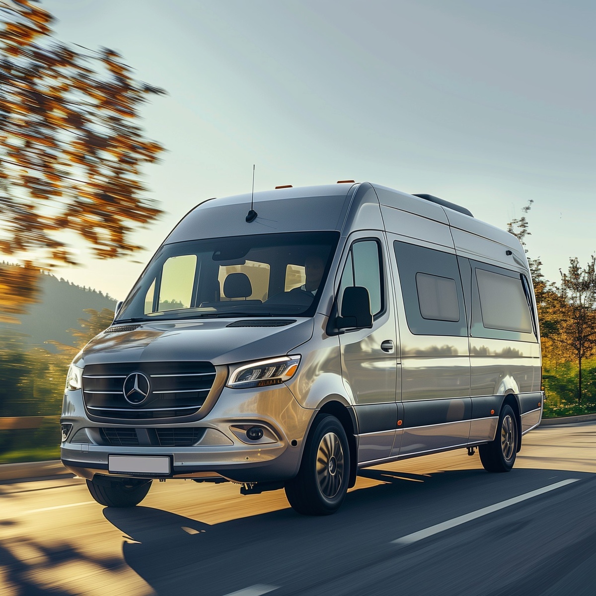 Создано на основе запроса: A ultra realistic photo of a silver Mercedes-Benz minibus driving on a street, with a bright and sunny atmosphere