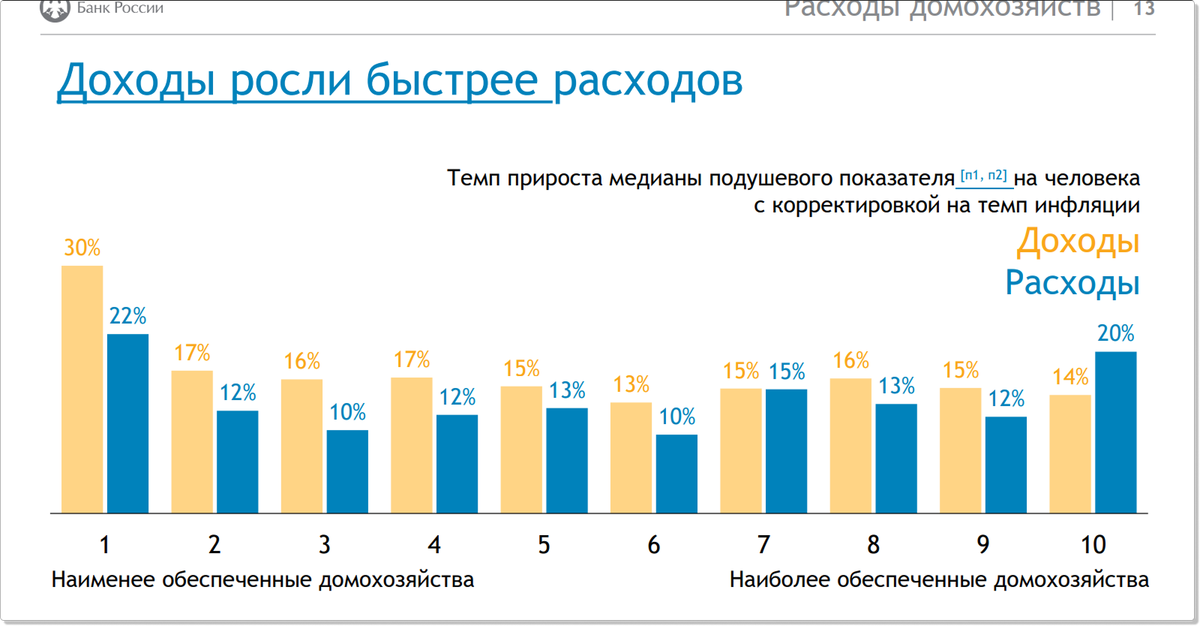 Не слышали про такое? Я вижу вообще почти везде, где речь заходит о соотношении роста доходов и расходов граждан. Поводом для статьи стала все та же статистика Росстата и ЦБ о том, что же с нашими с вами зарплатами и затратами происходит. Про то, в какой волшебной стране мы все живем по мнению Росстата, я на днях уже писала: Теперь о том, что мы (оказывается) делаем со своим стремительно возросшим благосостоянием. Цифры вроде как не лгут: Обратите отдельно внимание: расходы прям взлетели в космос у тех, наиболее обеспеченных и у наименее обеспеченных. Порадоваться за самых бедных - им аж 30% прибавили? Давайте порадуемся. Это те самые нашумевшие во всех смыслах водители "скорой" в Чебаркуле: была зарплата 25 тыр, стала аж 32! Так теперь живут очень зажиточные по определениям экспертов россияне. С одной стороны - о чем тут думать! Выросли доходы - деньги ляжку жгут, срочно чешется их потратить! Раньше ты себе позволить айфон не мог, а теперь можешь. Раньше уповал на общественный транспо