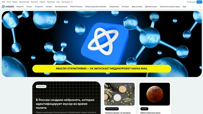 Материалы для сайта "Наука Mail" пишут ученые, разработчики и представители промышленного сектора VK объявила о запуске медиапроекта "Наука Mail". Он направлен на популяризацию науки и повышение интереса к научно-исследовательской тематике, сообщили amic.ru в пресс-службе VK. Издание публикует новости о передовых исследованиях и разработках, а также экспертные колонки и спецпроекты на тему космоса, энергетики, биотехнологий, агрономии, робототехники, ИИ и так далее. Со временем разделы будут развиваться и дополняться редакционными форматами и спецпроектами, которые охватят множество научных направлений. Контент для портала создают ученые, разработчики, сотрудники ведущих университетов и исследовательских центров России, а также представители промышленного сектора. Среди авторов – профессор Сколковского института науки и технологий Александр Квашнин, директор научно-образовательного центра "Полимерные и композиционные материалы SmartTextiles" Балтийского федерального университета им. И.