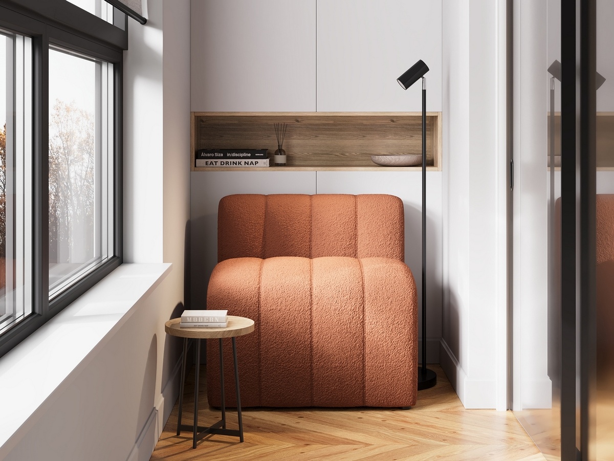 Мини-диванчик, кресло или мягкий пуф плюс журнальный столик — простой рецепт уютного уголка на лоджии для любителей долгих посиделок с книгой или ноутбуком.