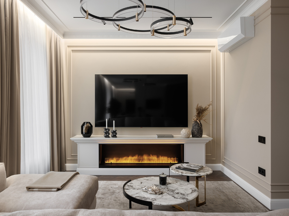 Дизайн-студия VIVENTSOVA INTERIORS создала функциональное пространство, наполненное теплотой, светом и контрастными черными деталями с нотками роскоши. Стиль современной классики подчеркнул достоинства планировки, а трендовый цвет стен и золотые элементы добавили элегантности пространству. Основная задача — создать функциональную планировку, отвечающую ритму жизни современной семьи, и сделать интерьер роскошным в стиле современной классики с элементами ар-деко. Мы присоединили площади лоджий к спальне и кухне, увеличив таким образом полезное пространство, что позволило создать спальню со своей гардеробной комнатой и поставить большой обеденный стол в столовой. Между кухней и гостиной мы подняли выше монолитную перемычку, заказав проект расчета нагрузок и усиления с официальным согласованием. Это позволило нам сделать единый потолок на эти два помещения и создать ощущение единого пространства. На кухне мы использовали кварцевый агломерат и на столешницу, и на стену с переходом рисунка.