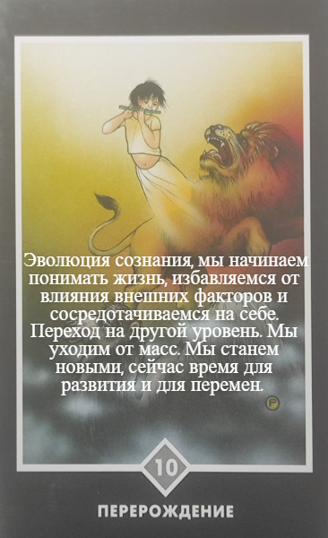 карта иллюстрирует теорию эволюции сознания, данную Фридрихом Ницше в книге «Так говорил Заратустра»: верблюд – лев – ребенок. На какой бы стадии не находился вопрошающий, пришло время расти дальше. Настало время роста и перемен.
