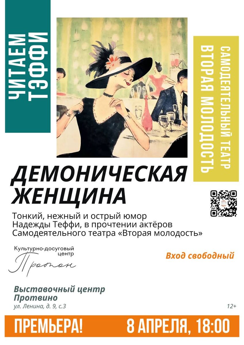 ✨ «Демоническая женщина». 👉«У нее подняты брови трагическими запятыми и полуопущены глаза…» 📢📚Знаменитое, юмористическое произведение русской писательницы и поэтессы Надежды Тэффи в прочтении актеров Самодеятельного театра «Вторая молодость». 🚫 Возраст: 12+ 📆 08.04.2025 🕒 18:00 🏢 Выставочный центр "Протвино" 📍 г.о. Серпухов, г. Протвино, ул. Ленина, д.9 💰 Вход свободный❗️ #webСерпухов ✅ Мероприятия Серпухов https://dzen.ru/id/66f01c6eb4c6fe60c9ca1608 http://vk.com/serpukhov_events http://dzen.ru/serpukhov_events