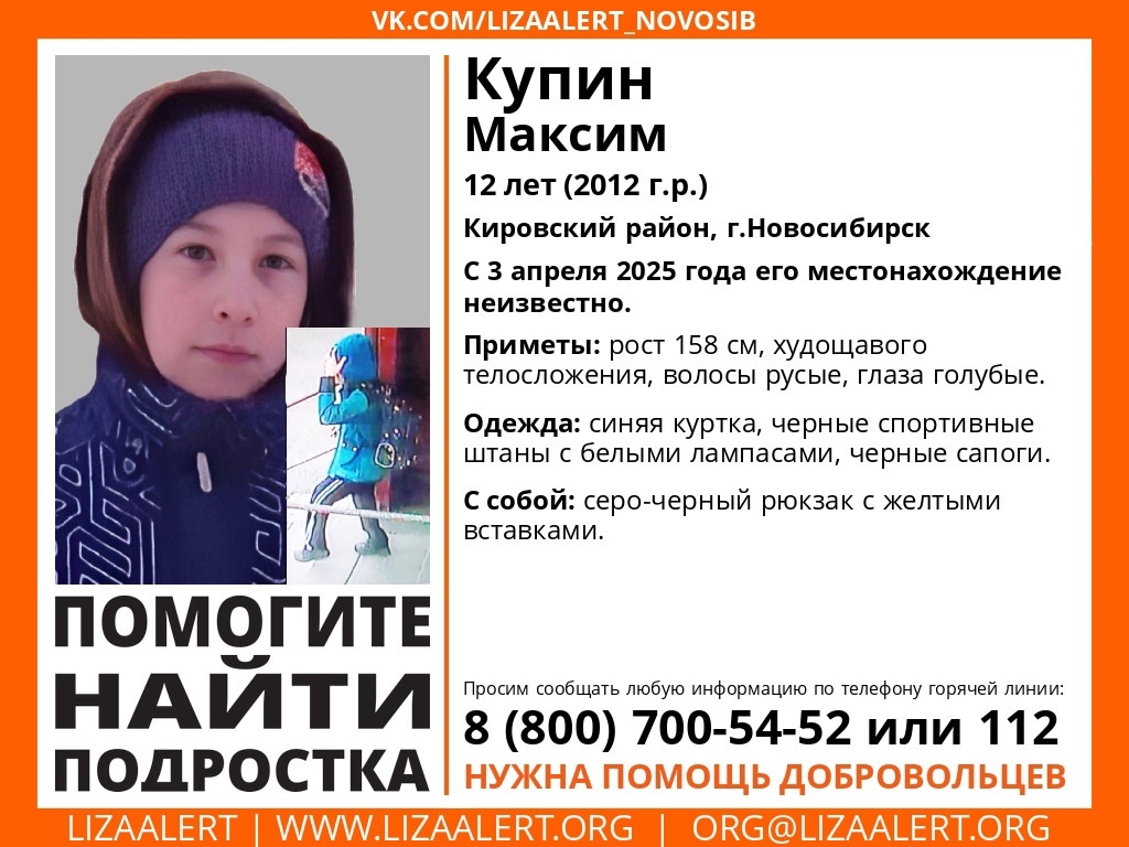 В Кировском районе Новосибирска пропал 12-летний Максим Купин. С 3 апреля его местонахождение неизвестно, сообщает поисковый отряд «ЛизаАлерт» Новосибирской области. Приметы Максима: рост 165 см, худощавое телосложение, волосы русые, глаза голубые. Был одет в синюю куртку, черные спортивные штаны с белыми лампасами, черные сапоги. С собой у мальчика был черно-серый рюкзак с желтыми вставками. Если вам что-либо известно о местонахождении пропавшего, сообщите, пожалуйста, по телефону горячей линии отряда 8-800-700-54-52 (круглосуточно, бесплатно) или по номеру 112. Также напомним, что в Новосибирской области до сих пор не могут найти 14-летнего Платона Шутова.