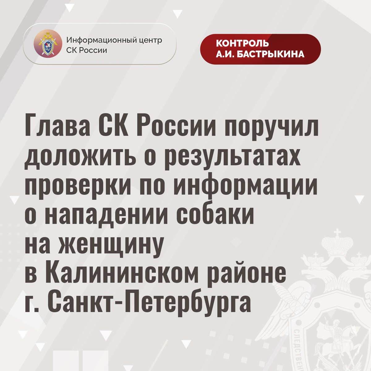 Глава СК России поручил доложить о результатах проверки по информации о нападении собаки на женщину в Калининском районе г. Санкт-Петербурга