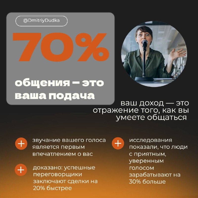 Вы когда-нибудь задумывались, как ваш голос влияет на ваш доход? 🤔 Именно звучание вашего голоса является первым впечатлением о вас. Правильная интонация, тембр и уверенность в голосе могут открыть перед вами двери, о которых вы даже не мечтали. 🔊 Исследования показывают, что люди с уверенным и приятным голосом чаще получают повышение, предлагают лучшие условия и привлекают больше клиентов. Лидеры в бизнесе понимают это и активно работают над своей речью. Почему бы и вам не сделать то же самое? 🎤 Улучшая свой голос, вы не только поднимаете свою самооценку, но и значительно увеличиваете шансы на успешные переговоры и продажи. Запишитесь на курс по ораторскому мастерству или просто начните ежедневно тренировать свой голос. Каждый ваш разговор — это возможность для роста. Помните: ваш голос — это самый мощный инструмен. Начните использовать его на полную мощность уже сегодня! 📍Подробнее о записи на мой курс ораторского искусства здесь👈🏻