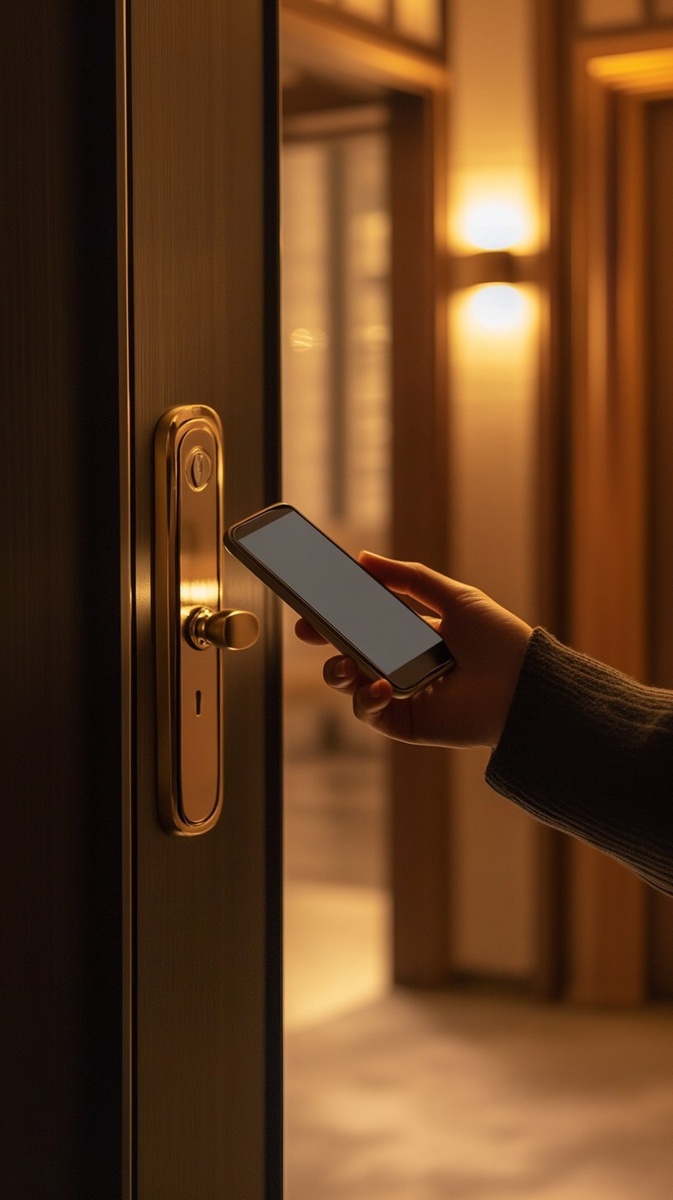 Создано на основе запроса: Someone tapping their phone to open a hotel room door