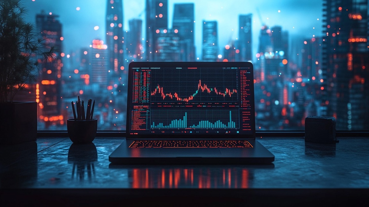 Создано на основе запроса: A hyper-realistic digital scene: a sleek laptop on a modern desk, showing a trading chart with real-time Forex or