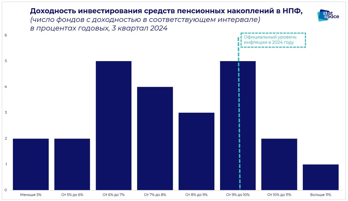 Доходность негосударственных пенсионных фондов По свежим ЦБшным данным о доходностях НПФ (за 3 квартал 2024 – и да, это правда самые свежие данные), доходность инвестирования средств НПФ за вычетом вознаграждения самого фонда (на графике именно она) в 3к2024 варьировалась от 2.53% до 11.4%. Сравните со ставками по депозитам! Для сравнения, инфляция в 2024 году (сравнение не супер корректное, потому что доходность-то 3к2024 к 3к2023, а инфляция именно за год, но что уж тут) составила 9.52%. И целых пять фондов показали доходность выше этого показателя! Фонды-лидеры – это "Атомфонд" (11.4%, 10 миллиардов рублей активов), "Ханты-Мансийский НПФ" (10.34%, 31 млрд) и НПФ "Профессиональный" (10.07%, чуть меньше 9 млрд активов). Крупнейшие фонды от крупнейших банков показали себя заметно хуже: фонд ВТБ продемонстрировал доходность в 5.05% (чуть больше триллиона рублей активов), фонд Сбера – 6.43% (чуть меньше триллиона рублей активов). В общем, лучшая пенсия по-прежнему – та, которую ты са