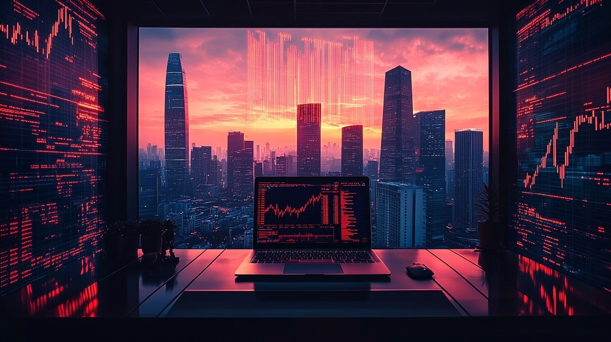 Создано на основе запроса: Futuristic trading scene: a laptop on a desk with illuminated Forex trading charts on screen. Behind it, a glass window shows tall futuristic skyscrapers. Floating in the air over the skyline, holographic graphs, candlestick charts, and live price data are projected. Neon lights, sci-fi finance atmosphere, ultra-detailed, 8K