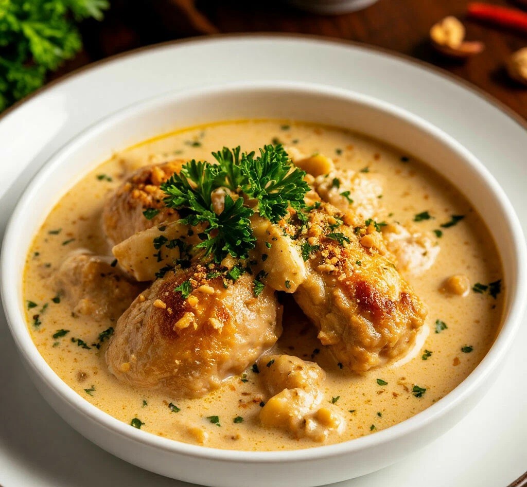 Ингредиенты: - Куриные бедрышки - 500 г - Лук - 1 шт. - Сливочное масло - 2 ст.л. - Мука - 1 ст.л. - Сливки 33% - 100 мл - Орехи грецкие - 30 г Приготовление: 1. В кастрюлю выложить мелко нарезанный лук, сливочное масло и растопить. 2. Добавить муку, хорошо перемешать и обжарить до золотистого цвета. 3. Постепенно влить сливки, постоянно помешивая, чтобы не образовались комочки. 4. Добавить грецкие орехи, нарезанные на мелкие кусочки или пробитые блендером. 5. Куриные бедра замариновать в специях и выложить в соус. 6. Тушить на медленном огне до готовности курицы. 7. Подавать шкмерули горячим, посыпав зеленью. Приятного аппетита!