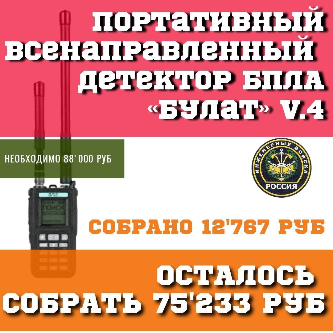 Доброй пятницы, друзья. Поработаем плодотворно?! Напоминаем, что идёт сбор на оооочень важную технику, от которой реально зависит жизнь бойцов и не одна... ⬇️ ⬇️ ⬇️ Детектор БПЛА"БУЛАТ" v.4 ✔️Устройство позволяет засечь беспилотный летательный аппарат на расстоянии до 1.5 км. Есть время принять меры! ✔️Детектирует все основные БПЛА. 🟢Сбор на "БУЛАТ": 📌Сумма к сбору - 88'000 руб. 🔺Собрано - 12'767 руб. руб. 🔺Осталось собрать - 75'233 руб. Заказывать будем у производителя. Время изготовления с момента оплаты составит около 2 мес. Просим максимального участия и поддержки! Любую посильную сумму можно перевести на номер карты 💳2202208188194204 или по номеру телефона 📞+79530562233 Получатель - Светлана Владимировна Л. (Сбербанк) #уралсвоихнебросает #вместемысила